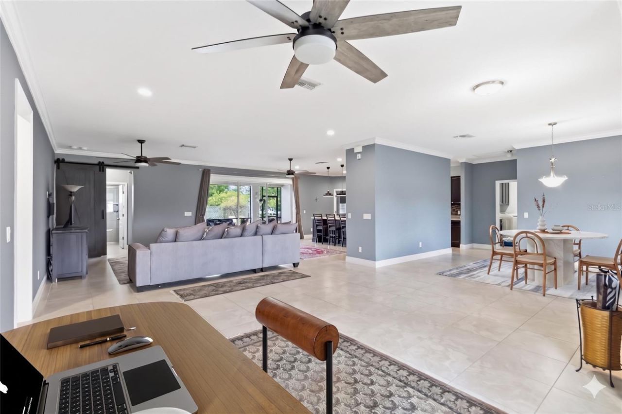 This Modern Craftsman Ranch home is sitting on a half acre. Chef-inspired Mocha Kitchen with BRAND NEW stainless steel APPLIANCES (Refrigerator, Dishwasher, Stove), granite island surfaces, and a captivating, stylish mosaic glass backsplash. Step into your Primary Bedroom that offers French door access to the covered Lanai that extends the living area to an outdoor oasis. The owner has invested in a customized, electric Drop shade for the large sliding glass doors leading onto lanai, while the secondary bedrooms include a flexible space configured as a bright home office and another as a charming bunk room. Enjoy your mature backyard that includes a serene atmosphere with a firepit, raised vegetable gardens, and a countered courtyard. A Brand New OUTDOOR SHED installed in 2023. Other upgrades include a well water tank 2025, a water Softener in 2025. Brand NEW A/C. The layout is one of a kind; in that every area has its own bathroom