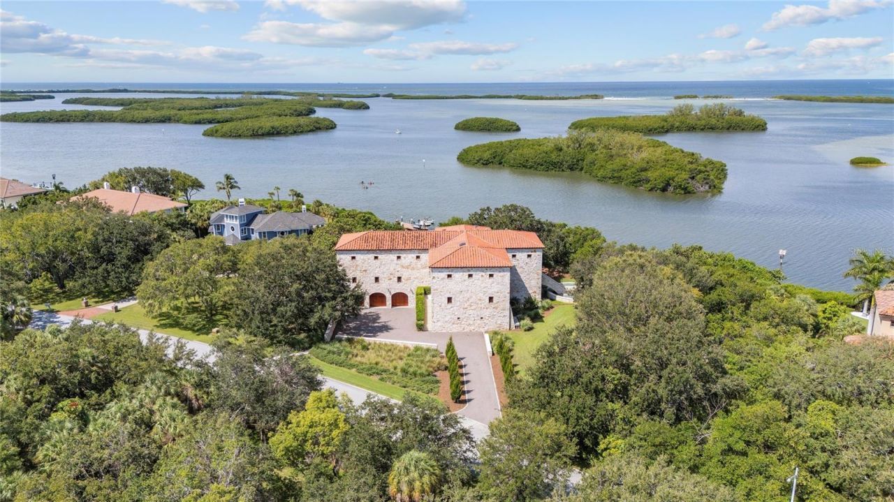Welcome to Tre Sorelle, a home of splendor and architectural authenticity, a true Tuscan farmhouse nestled in the premier waterfront community of Tierra Verde. From the early stages of its conception, which involved trips to Tuscany to research design and source materials, to the meticulous level of construction, every detail was given exceptional attention. This magnificent masterpiece provides seclusion and privacy, breathtaking beauty and luxurious quality that leaves a lasting impression. From the massive spread footings, concrete block structure (8 x 8 x 16 blocks) from foundation to roof line, and the first-floor living area situated at 13 feet above sea level, this home was constructed to withstand the tests of Mother Nature. In addition to the concrete block outer shell of the home, the entire exterior wall features a 10-to-12-inch layer of limestone quarried in the Province of Barletta-Andria-Trani and container shipped from Italy. The exterior walls are 18-to-20 inches thick in total, which is extraordinary, but perfect for Florida weather and lifestyle. The roof is a Ludowici Italian authentic cap and pan terra cotta roof tile with a 75-year warranty and the hurricane-impact windows and doors are a combination of Tischler und Sohn (U.S.A.) and Hope's Windows, the world's pre-eminent manufacturers of custom windows and doors. Encompassing over 12,000 square feet of luxury living, the home has seven bedrooms, eight full baths, three half baths, library, two offices, elevator, gym, and four-plus-car garage. Features of this home include soaring ceilings, impressive Douglas fir beam and plank work, solid mahogany doors throughout, and, extending from the lower-level entrance to the top floor, a beautiful cool honey-colored, pink veined Corton limestone spiral staircase, a stone steeped in French history emanating from the Burgundy region. The main level comprises an open floor plan with living room and gourmet kitchen, casual dining, formal dining room, two offices and a guest suite. The upper level features six en-suite bedrooms and a sun-filled library. The lower level has additional storage rooms, and gym. A tranquil oasis awaits outside, complete with expansive, covered lounging and dining areas, a fire pit surrounded by a moat and a salt-generating chlorine pool heated by a geothermal system, utilizing energy efficiency. Ideally located close to the thriving downtown of St. Petersburg and the Gulf beaches, less than 30 minutes to Tampa International Airport and yet perfect for those who are seeking peace and serenity.
